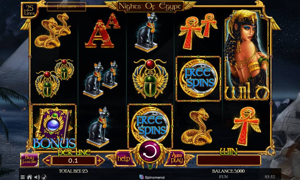 The Nights of Egypt slot machine from the Spinomenal provider has a standard playing field, consisting of 5 reels with 3 symbols. Payouts are made on 25 lines.