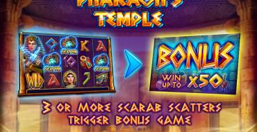 Please pay your attention to the long line between the reels and the control panel. It shows important information by the game. «Pharaoh’s Temple» offers to set up the sound parameters and size of the screen. The game is available in a browser due to the flash mode. The rules tab is hard to call highly informative, so you better watch our video review.