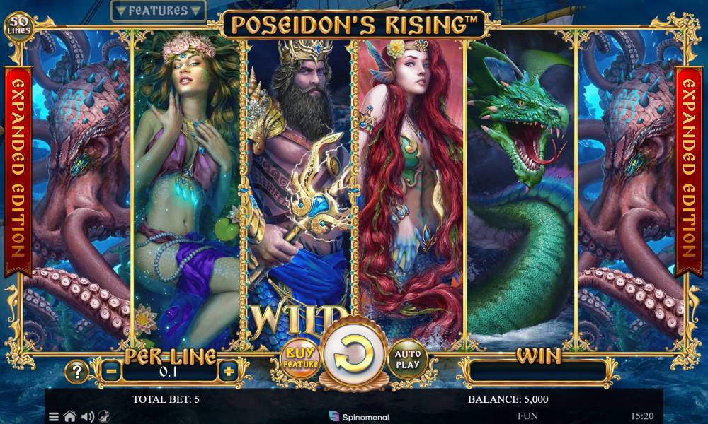 The interface of Poseidon’s Rising Expanded Edition slot machine from the Spinomenal provider is simple. The main menu, bet selection, spins, and auto-play buttons are on the right.