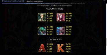The Poseidon’s Rising Expanded Edition slot machine from the Spinomenal provider has a standard playing field, consisting of 6 reels with 4 symbols. Payouts are made on 50 lines. The betting range is from 50 cents to 500 dollars per spin.