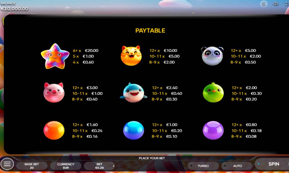 The Power Balls video slot is arranged as follows: 6 reels in 5 rows, cascading mechanics and Scatter payouts. It doesn't matter where the symbols are located to form a winning combination. The more identical symbols there are, the bigger the payout they will bring. The winning combination of symbols disappears, making room for new ones. In this case, the appearance of 8 or more identical symbols give a multiplier to the bet (for the Star symbol - 4 or more). Learn the exact values of multipliers for different numbers of symbols can be found in the pay table. The maximum multiplier x100 to the bet is applied in the case of falling out 6 or more Stars. The range of bets - from 0.20 to 100 euros.