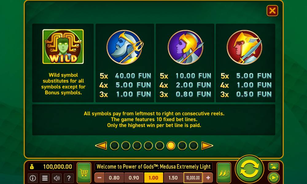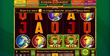 The Power of Gods: Medusa Extremely Light slot uses a standard layout with 5 reels, 3 rows and 10 fixed paylines. The size of the bet you set yourself and it is possible from 0.2 to 10,000 coins, which makes the game available to players with different financial capabilities. The maximum bet can be raised 2500 times. To win, you need to collect a combination of 3, 4 or 5 identical symbols on the active line. Prizes are formed only from the leftmost reel. Symbols include mythical warriors, standard card images,. There are special symbols to trigger the Hold the Jackpot bonus game. The Wild symbol substitutes for any other paid symbols to help form winning combinations. The game also features a risk game option where you can double any winnings by guessing the color of a flipped card.