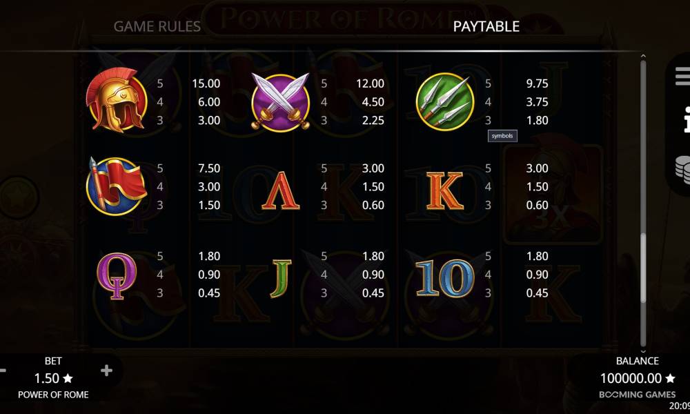 The great Roman Empire was famous not only for its legions, but also for its wealth. That's exactly what you can hunt for in the Power of Rome slot from Booming Games. It was released in early 2024. The design of it fully corresponds to the name: on the field the player will see harsh legionnaires and their weapons. If luck is on the side of the gambler, Power of Rome can make him richer by x2500 of the bet. Bonus functionality in the slot is small, but due to the average volatility and additional multipliers in freespins there is a chance to play in the plus.
