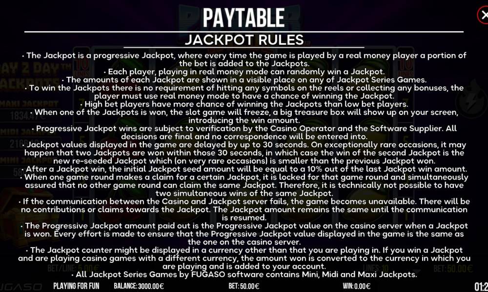 The Day 2 Day Jackpot indicator is on the left of the reels, while the controls are on the right. The displays of the Power Wildz Fruit Saga slot are located below the grid. There is no payout boosting game in this video slot.
