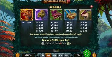 In Raging Rex 3 there are 6 reels, each with a height of 4 cells, constantly active. The number of lines for combinations is 4096. To get a payout on one of the lines requires a minimum of 3 identical symbols in a row, or with the use of a joker. In this online slot for big wins do not have to wait for bonuses or freespins, as coefficients in the table payouts are quite high. The spins involve 10 regular and 2 special symbols. The player can choose the stake from the range from 0.1 to 100 c.u., with the maximum allowable winnings of x30000.