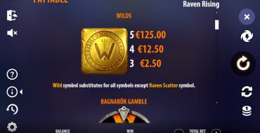 The Raven Rising video slot features 5 reels in 3 rows with 20 fixed paylines. Winning combinations are formed by identical symbols that are placed in a row on neighboring reels with a start from the left edge. The game starts with a x1 multiplier, which increases by 1 each time a winning combination is triggered. The falling out of 3 or more identical symbols promises certain multipliers to the bet, their sizes according to the types and number of symbols are given in the pay table. The bet size ranges from 0.20-100 euros.