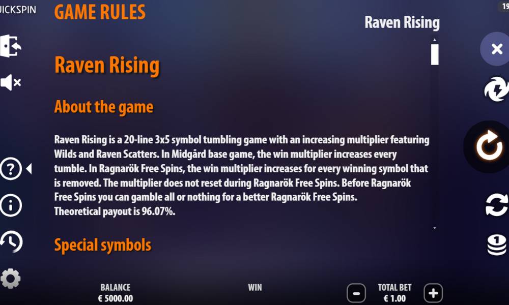 For the Swedish company Quickspin the theme of epic battles in the day of Ragnarok is close enough, respectively video slot Raven Rising turned out to be exciting, fully in the spirit of the famous Scandinavian myths, while filled with quite modern bonus functionality. The game features increasing multipliers, a series of free spins, a risk game in the original interpretation. The odds of a maximum win of x6,804 are very high!"