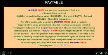 Every player can get one of the four jackpots. To do this, you need to find 3 identical cards among the 12 cards. Their suit will mean the Jackpot. The maximum one is spades. All jackpots are progressive, which means that they do not have a fixed size. After receiving the prize is zeroed and grows again, and so on until the next win.
