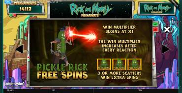 | Bonus games | Free Spins, Mystery Symbols, Megaways, Bonus Wheel, Random Wilds, Avalanche, Cascading Symbols, Pickle Rick Free Spins, Federation Free Spins, Vindicators Free Spins, Mystery Free Spins, Symbols collection, Free Spins Mode, Free Spins Multiplier, RTP range, Scatter symbols, Multiway (+1024), Spin The Wheel, Wild |