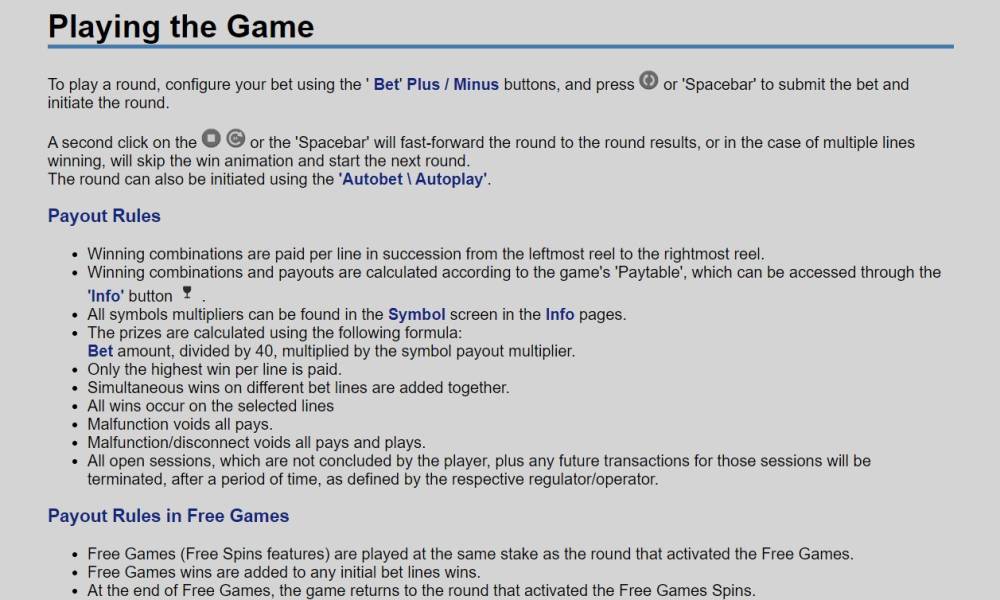 The machine can only be played on forty lines, on which equal bets are accepted: 0.01 - 0.50 dollars each (0.40 - 20 dollars per spin). Operators may offer other ranges.