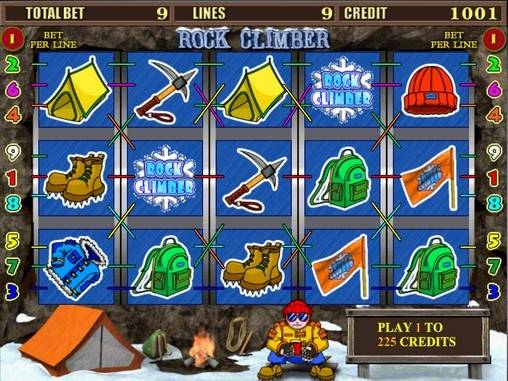 Rock Climber is a slot machine with five reels, nine lines and the maximum bet of 225 credits. It has a game on even chances and a bonus round. The bet size is traditionally selected by the button Bet, and the number of lines is chosen using the button Line. To spin the reels, click on Start. If you are lucky enough to win a certain number of credits, they can be transferred to the account or you can try to increase their sum in game for doubling (the button Double). In this round, the game takes place with the help of five cards. One of them belongs to the dealer and it is faced-up. The other four cards are faced-down and you have to choose a card, hoping that it will be higher in rank compared to the dealer's card. In this case, your payout will be doubled. If your card has a lower rank, you lose. In case if the cards have equal ranks, new cards are dealt. The total number of dealings is not limited. You will either lose or decide when to collect the payouts The section Help in which you can read the rules and the pay table can be opened by clicking on the button Help.
