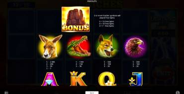 You will land 8 regular symbols on the reels: a kangaroo, a crocodile, a dingo, an eagle and lower-paying J to A royals. Same symbols may land in a stacked formation.