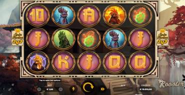 The playing field is set against a background of steps. The reels occupy the center location, and the buttons are at the top and bottom. The slot uses an oriental theme, bright warm color scheme and melodic musical accompaniment. To start the game user needs to: