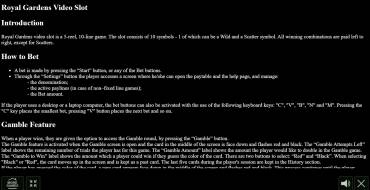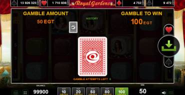 The Royal Gardens slot has a 5x3 grid, with 10 non-fixed paylines (i.e. you can select 1, 3, 5, 7, 10). Chains collected from left to right are paid. The four older symbols give the reward for 2-5 pieces, and the five younger ones - for 3-5. The slot provides free spins, risk game, jackpots. The bet can be made in the amount of 1, 2, 5, 8, 10 coins per line. The nominal value depends on the casino. Maximum winnings - x5000 of the bet.