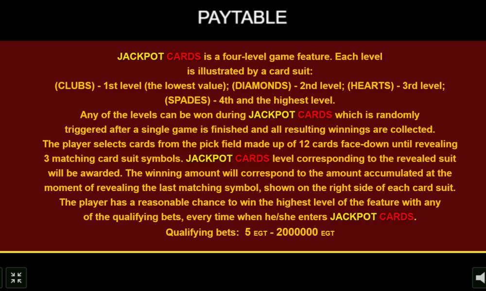 To scoop the progressive jackpot, you need to find three identical cards out of 12. The prize corresponds to the suit (the highest is spades, the lowest is clubs, with hearts and diamonds in between). Jackpot Cards round is launched independently at a random moment, the player can not initiate it. It is activated quite rarely and gives the opportunity to get only one jackpot at a time.