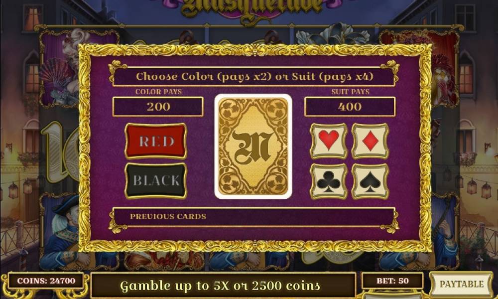 «Royal Masquerade» online slot machine has five reels, ten pay lines, three rows of symbols at the screen and several gaming features, such as the basic and the special elements, free spins and the gambling feature. You can use any number of active lines from available quantity. Only equal bets in range from one to five coins of the following value: 0.01, 0.02, 0.05, 0.10, 0.20, 0.25, 0.50, 1, 1.50 or 2 dollars, can be staked per each of the lines. This way, you can stake from one cent to one hundred dollars per spin. Standard symbols bring payoffs forming combinations at the active lines. The combinations are continuous chains of the similar elements, which have to begin from the first left reel necessarily. To make a combination you have to hit at least three symbols. In case you make a combination of four or five symbols at one of the lines, only the longest chain brings a payoff, however, several paid combinations can be formed at different lines by results of the same spin. An amount of the win is calculated by two values: the special index provided by the rules for each of the possible combinations (from x5 to x1000) and the bet per line. These values are multiplied. The total amount of the win can be immediately transferred to the player’s account or staked in the gambling feature. This round takes place at the special screen. Here you can see a face-down card and would have to guess its color or its suit (on your choice). Correctly selected cold double up your payoff, while the suit increases the win four times. It is possible to play up to five times without right for any mistake. The first incorrect answer means that you lose the whole bet. According to the official website of the producer, this game pays back 96% of the all customers’ bets at the long gaming period.