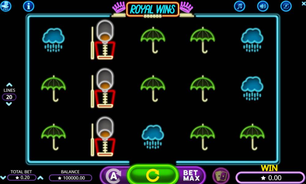 At the end of 2017, Booming Games released the Royal Wins. It is a slot with an unusual neon design, dedicated to the culture of the UK. It has a small field and line payouts. The number of lines is selectable. The maximum payout is surprisingly low - only x200. But a large range of bets: you can bet up to 200.00 for 1 spin. There is a risk round, freespins and Stacked Symbols.