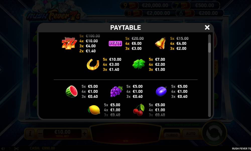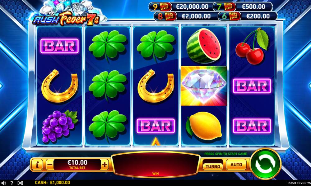 The Rush Fever 7s slot machine from the provider Ruby Play is all about a classic theme. If you're lucky, you'll be able to win big prizes, up to 2,000 bets. This is possible due to fixed jackpots that are triggered when special symbols appear.
