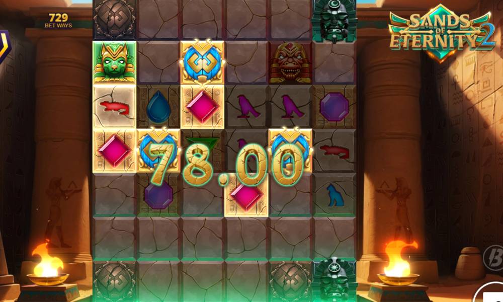 The Sands of Eternity 2 is a video slot with a unique dynamics with 6 reels and up to 7 rows. At the beginning of the game uses a 6x3 grid format with 729 active paylines, which can increase to 117,649 thanks to the avalanche mechanics. Each spin triggers a sequence of events, when a winning combination is formed, the participating symbols disappear, and in their place fall out new ones, which gives the opportunity to obtain additional wins within a single spin.