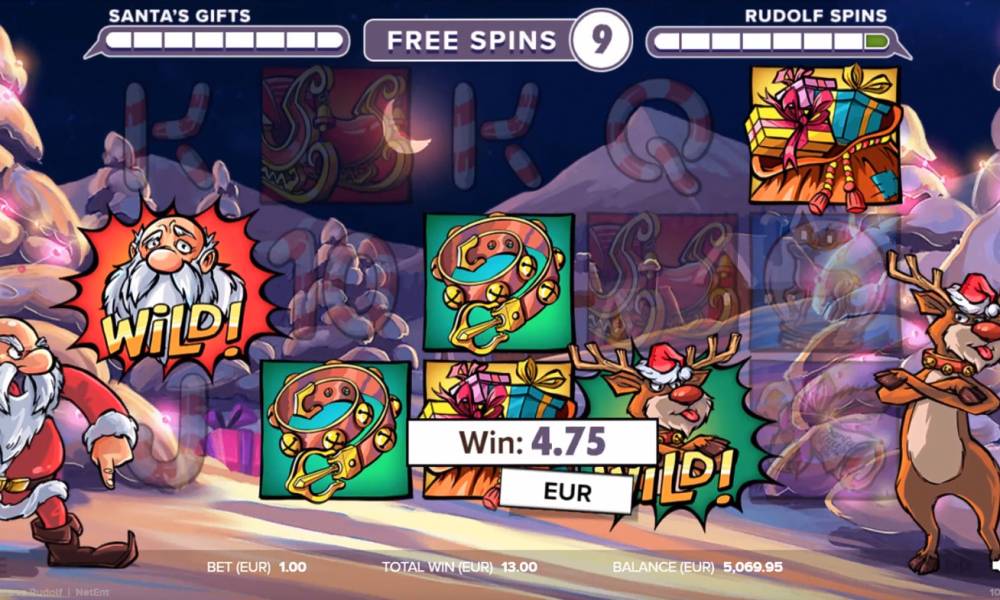 • Rudolf Spins – five free spins with five sticky wilds (Rudolf) at random cells.