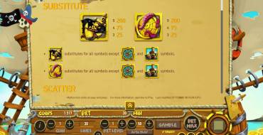 This slot has five reels and thirty pay lines, always active of default. Bets per each line must be same. It is possible to stake up to ten coins from one cent to twenty dollars value per line (from thirty cents to six thousands dollars per spin). However online casinos may set their own betting limits. Symbols are located in three rows at the screen. Except the basic icons, there are Wilds, Scatters, Bonus symbols, a gambling feature, prize rounds and free spins. An ordinary paid combination is a solid chain of several same icons, situated next to each other from left to right at one of the active lines. Numerous combinations can be formed in result of a single spin, but only the maximal option at each line is taken in account. Each of the possible combinations is provided with a special index from x5 to x200. It is multiplied by the bet per line. You can collect all money received in result of a spin or stake it in the gambling feature. This round is designed in style of comparing the cards. You have to pick one of four face-down cards. If it hits the dealer’s card, your payoff is doubled up. If the dealer wins, you lose the bet. Draw is possible too. Please read about special symbols, exceptions from the general rules and bonus features of «Scruffy Scallywags» below in the review by Casinoz.club.