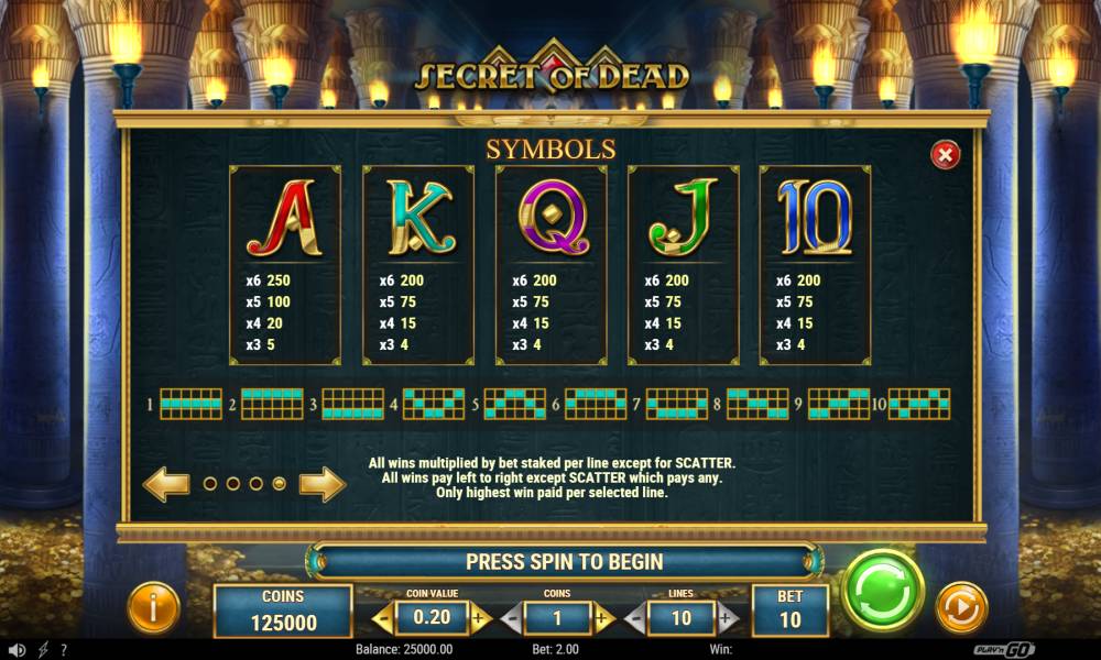 The Secret of Dead slot machine from the Play’n Go provider consists of a 6x3 playing field. Payouts are made on 10 pay lines.