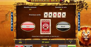 «Serengeti Heat» offers to form combinations by AllPay system. Three, four or five same elements have to be situated at any cells of the neighbor reels. The combinations may begin from the first reel, developing from left to right, as well as from the last one, in opposite direction. If the combination consists of five elements, only the one, which begins from the first left reel, is taken in account.