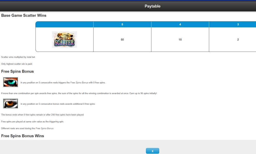 The bonus game is represented by the tiger's eye symbol. Activating this bonus is not easy - you need to collect the symbols on five consecutive reels. If you manage to trigger the bonus, you will get 8 free spins. The bonus game is represented by the tiger eye symbol. To activate this bonus is not easy - to do this you need to collect symbols on five consecutive reels. If you manage to trigger the bonus, you will get 8 free spins. During the free spins on the reels appear twice as many stacked bonus symbols, which significantly increases the chance of re-activation. В In total, you can get up to 240 freespins per bonus round.