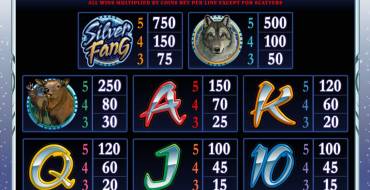The combinations formed at the active lines and consisting of three (or two for Wilds) and more similar symbols, which have to be situated at the neighbor reels, starting from the first left one, are charged with payoffs in Silver Fang slot machine. To calculate an amount of the payoff, it is necessary to multiply the bet per line by the special index, provided by the table for each of the possible combinations (the maximal is x1000). The exception is Scatter symbols, which act by the special rules.
