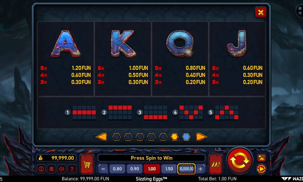 The Sizzling Eggs slot machine from the Wazdan provider has a standard playing field, consisting of 5 reels with 3 symbols. Payouts are made on 5 lines.