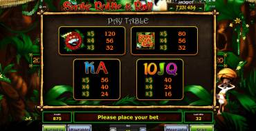 As the model supports multiply languages, it is easy to understand functions of all buttons and windows even for very beginners. It is only possible to select an amount of the bet before you run a new round. Number of the active lines is always same. Automatic and manual modes are available. If you choose the second option, you can stop spinning reels in advance. The user’s settings allow to set up sound and screen parameters. The model is available in a flash mode, so you don't need to download «Snake Rattle & Roll» video slot. The pay table provides all necessary information about the rules. More details of all features can be found on the Help.