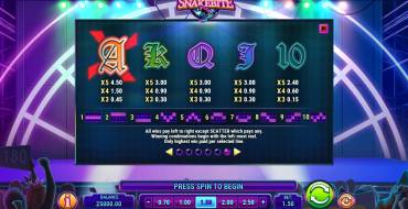 The interface of the Snakebite slot machine from the Play’n Go provider is understandable. You can choose the bet and active lines, make a spin, call the helpful information, and activate the risk game at the bottom.