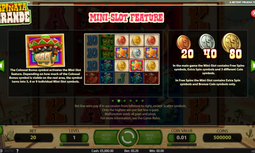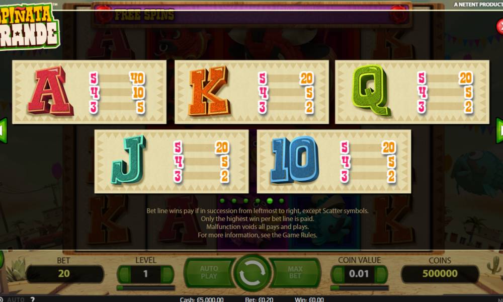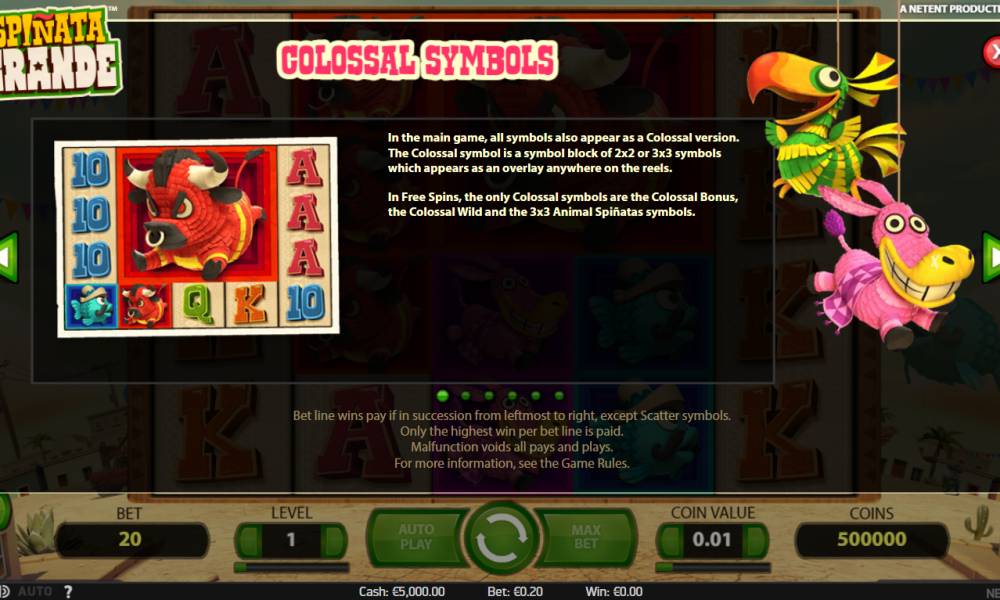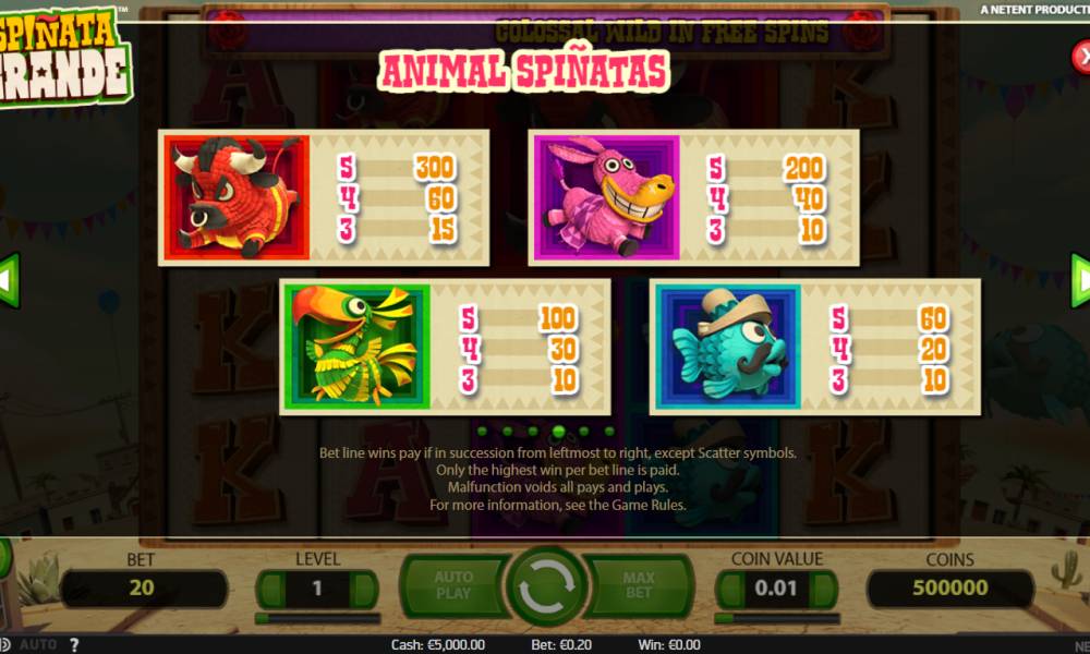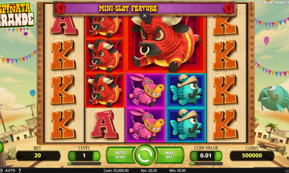 The video slot Spinata Grande, which was presented by Net Entertainment, is dedicated to an interesting tradition that is common in some countries. It's about animal figurines filled with sweets. At various festivals they are hung from the ceiling so that children can have fun, breaking them and treating candy. But the model is interesting not so much for its funny name, which apparently plays on the words "piñata" (the same figure) and "spin", as for its unusual special symbols and bonus features. Read about them in our Casinoz review.