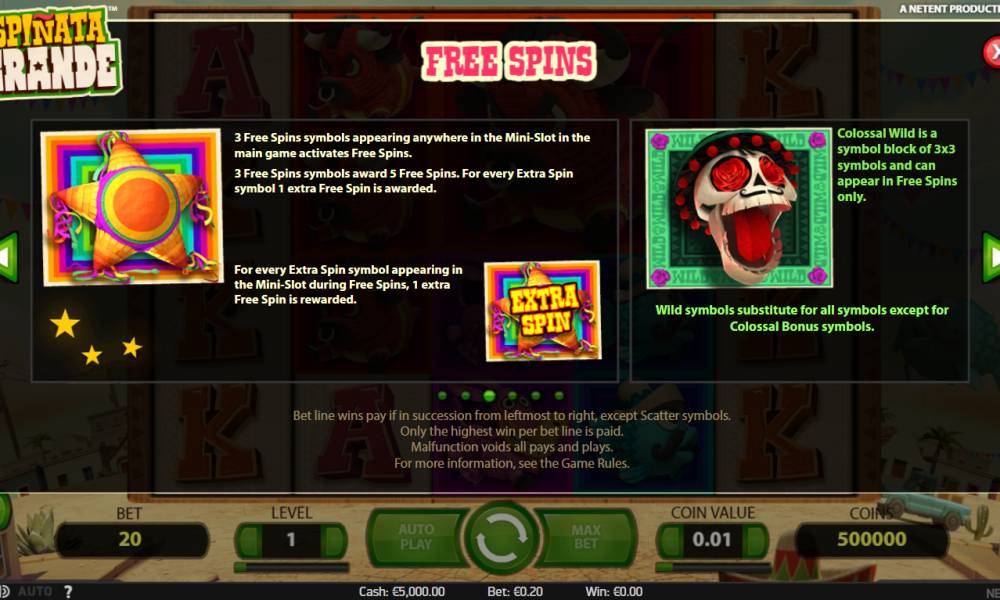 When three Scatter symbols (star-shaped piñata) fall out, the freespins begin. They start when three Scatters fall in any position on the reels of the mini-slot.
