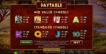 The gaming symbols, imaged at the reel of this video slot, are playing cards decorated with African ornaments, and wild animals, such as antelopes, zebras, giraffes, eagles, cheetahs and elephants. Images of elephants show up in vertical stacks at the reels.