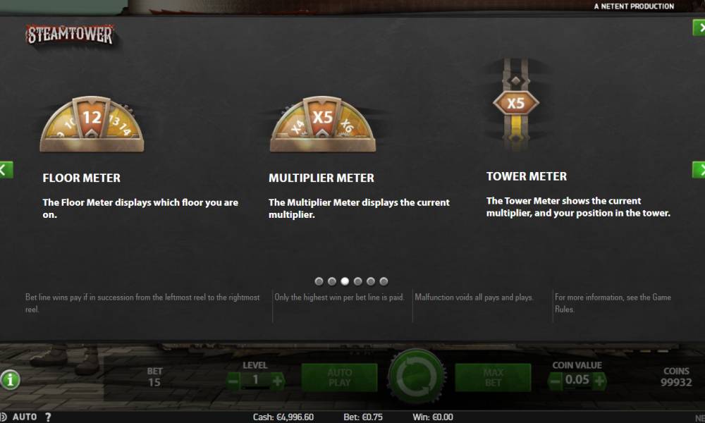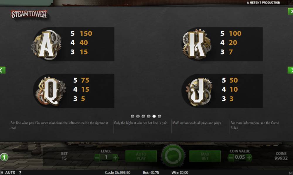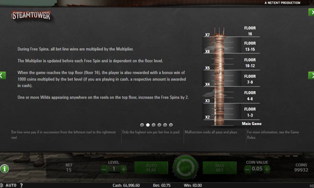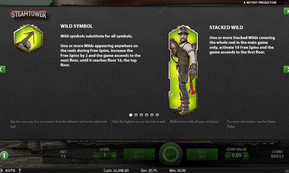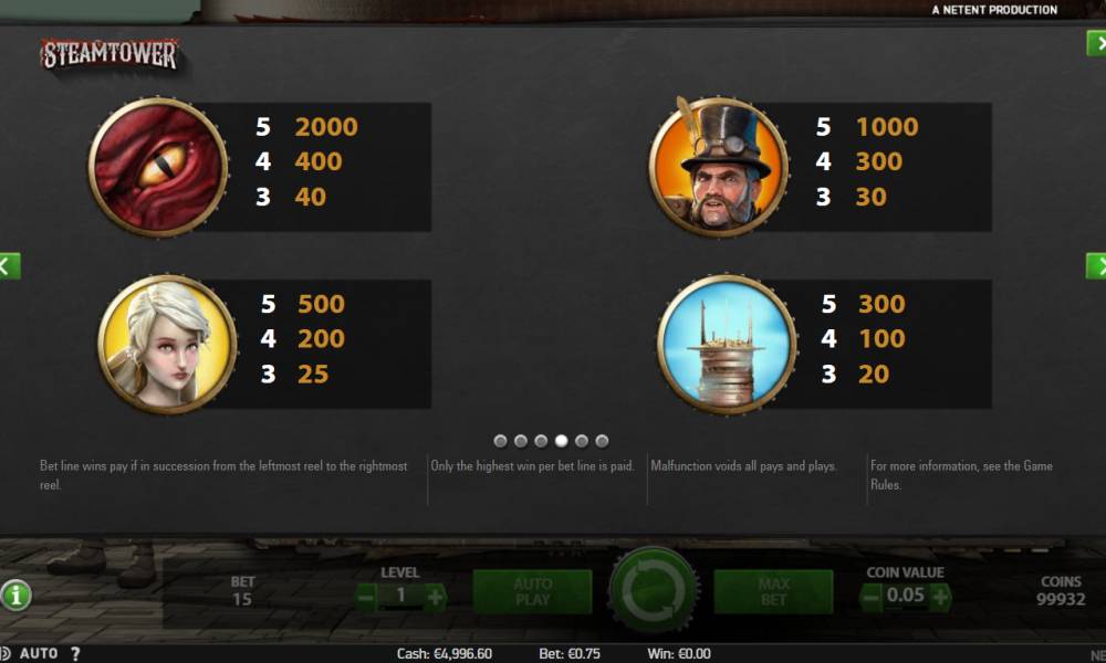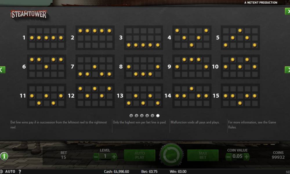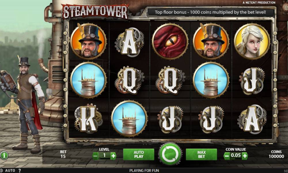 "Steam Tower" is a 5-reel slot with fifteen constantly active lines. Each of them accepts up to ten coins (bets on all positions are necessarily the same) in denominations from one cent to one euro (Unibet example). Thus, it is allowed to play the slot machine at a maximum rate of one hundred and fifty euros.