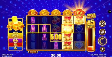 Wild Stellar 7s. This is an unusual Wild bonus that activates automatically if you fill 3 cells above any of the reels. When activated, it adds a sticky Wild feature to its reel. That is, on the first spin with Wild Stellar 7s you will definitely get a Wild symbol on that reel on the first (top) row. On the second spin it will appear on the first and second rows, and so on until the last row. At the same time, this function can be activated on several reels.