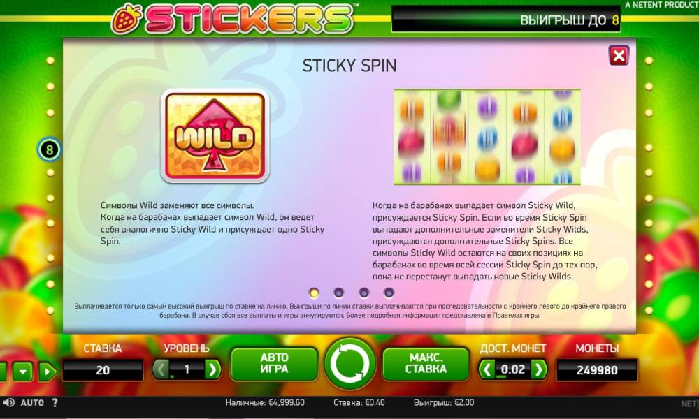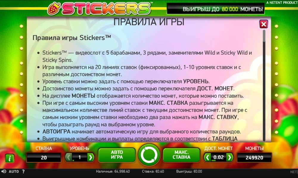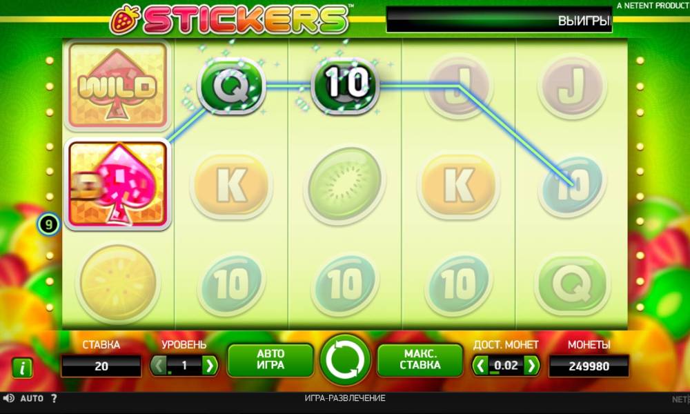 Stickers is a 5-reel video slot with twenty lines permanently engaged, on which bets of the same size are accepted. The range extends from one to ten coins in denominations of 0.01, 0.02, 0.05, 0.10, 0.20, 0.50 and €1. It turns out that the spin is allowed to bet from twenty cents to two hundred euros.