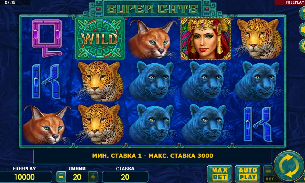 The Super Cats slot from the provider Amatic Industies has a classic playing field consisting of 5 reels with 3 symbols in each. Payouts are made on 20 paylines.