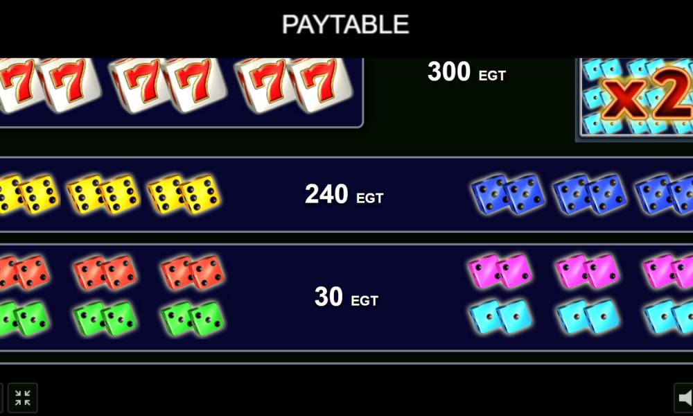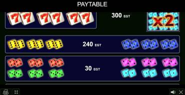Multiplier Feature. Four low paying symbols (dice with 1, 2, 3 and 4 dots) can bring bigger rewards. Nine identical symbols on the field from this category always bring Multiplier x2 to the amount awarded according to the pay table. Accordingly, the payment will be made on all 27 lines and multiplied by 2.