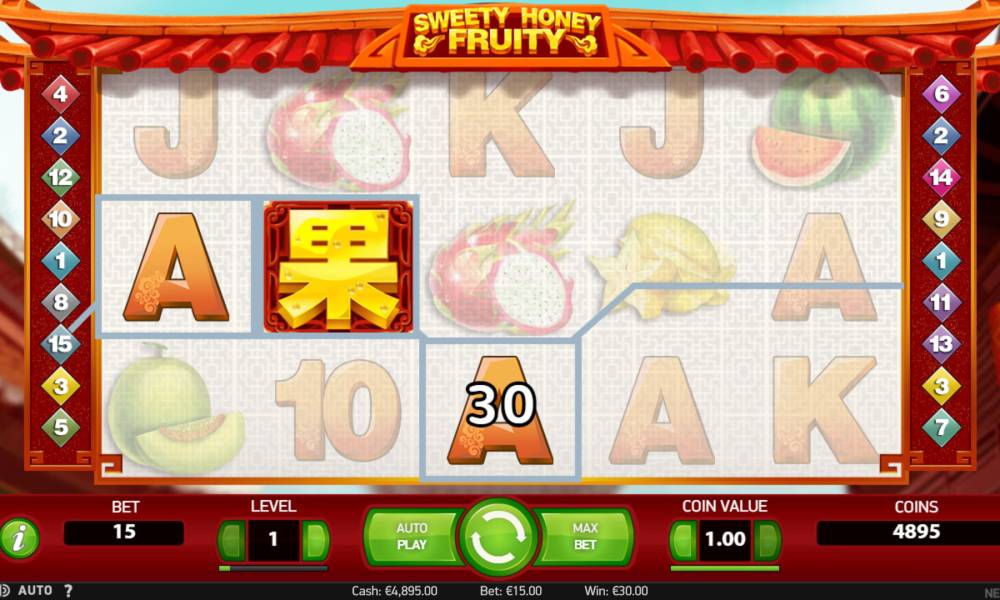 The Sweety Honey Fruity is an online video slot with five reels, fifteen lines for combinations, and three rows of symbols at the main screen. All lines are always active on default.