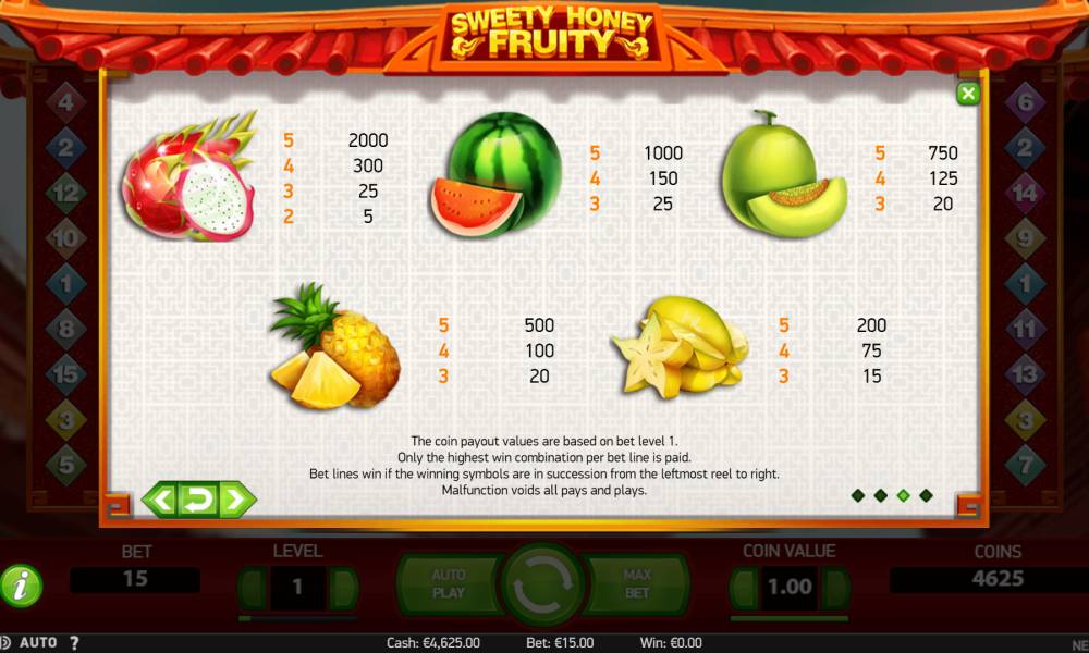 Please read about special symbols and bonus options of the Sweety Honey Fruity by NetEnt below in the review at Casinoz.club.