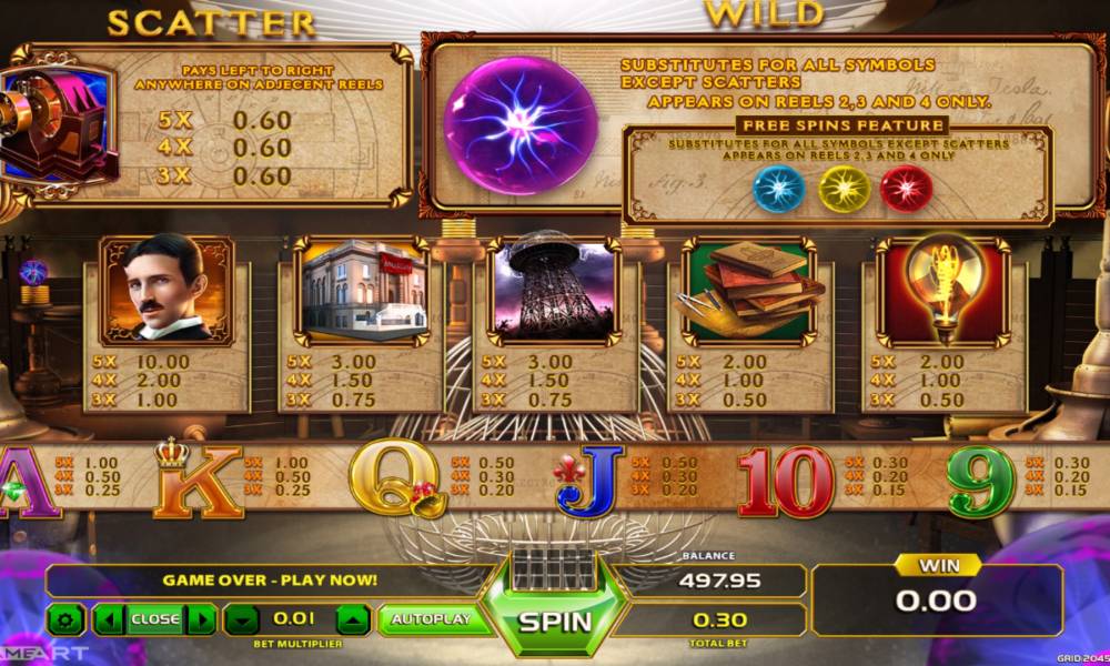 «Tesla: Spark of Genius» is a five reeled online video slot with 243 ways of forming winning combinations without active lines. Accepted bets are always thirty divisible. Each of such coins can be of the following value: 0.01, 0.02, 0.05, 0.10 or 0.20 credits. This way, it is possible to stake from 0.30 to 6 credits per spin (betting range can be different in some online casinos). Except of the basic symbols, this game is provided with special elements, a round of gambling feature, free spins with advanced options and some other interesting features, discussed below in the article. The standard symbols bring payoffs when several same icons appear somewhere at the neighbor reels, including the first left one. An amount of the win is calculated by the bet and the special index provided by the rules for each of possible combinations. It can be from x15 to x600 here. Quite often several combinations can be formed by results of the same spin. In such cases all credits are summarized. The total amount of the win received by results of the round can be collected immediately and transferred to the main gaming account, or staked in the game of chance, which takes place at the special screen. Here you need to guess a color of the face-down card to double up your credits. It is possible to play several times running. Unfortunately, we don't have any information about the theoretical payback index of this slot machine.
