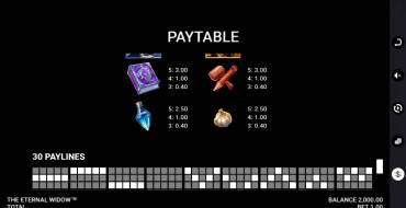 The field size in The Eternal Widow is 5x4. Bets are accepted in the range of 0.2-50$. Winning lines are 30, you can not change this number. The winning limit is x5000. There are free spins, usual and unusual Wild features and Multiplier. There are no jackpots and bonus rounds.