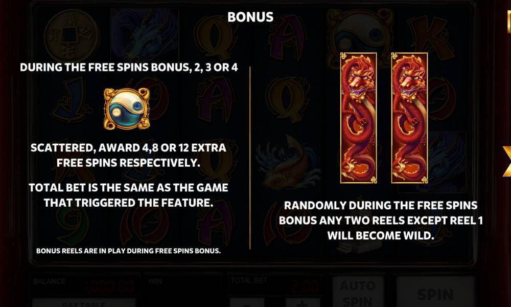 A rollout of 3, 4, 5 Scatter symbols awards 8, 12, 20 free spins respectively. These are played out with the last valid bet on the standard field. During the round, two reels are guaranteed to be completely covered with red dragons (they change between spins). This makes it more likely that you'll win more often and bigger.