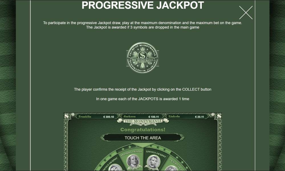 The Moneymania has 5 reels with a height of 3 cells and with 9 fixed lines. Combinations are made from the left edge to the right edge. A minimum win requires a minimum of 3 identical symbols in a row, except for Scatter and Collect symbols. The slot does not realize the usual freespins, but there are bonus games and draws in the form of accumulative jackpots. The bet is set by the player from the range of 01. to 20 euros, but to be able to play the jackpot must be set the maximum. The casino is at liberty to set its own values based on customer preferences. The largest win in normal mode or in bonuses is x500. In total, the slot has 8 regular and 3 special symbols.