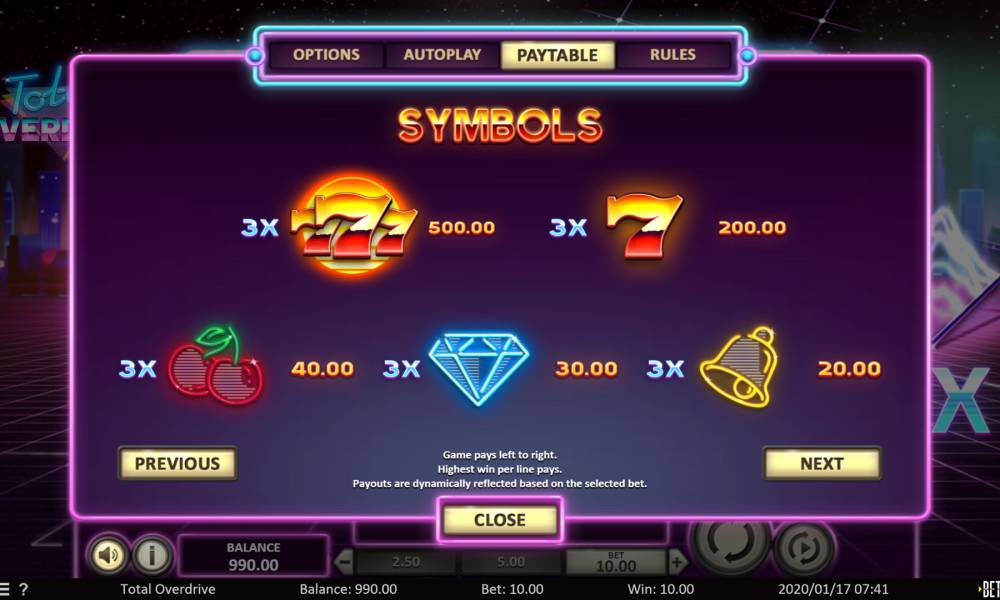 Total Overdrive is a video slot that features 3 reels and 5 fixed active lines. You can place equal bets from as little as 1 cent to as much as 2 euro per line.