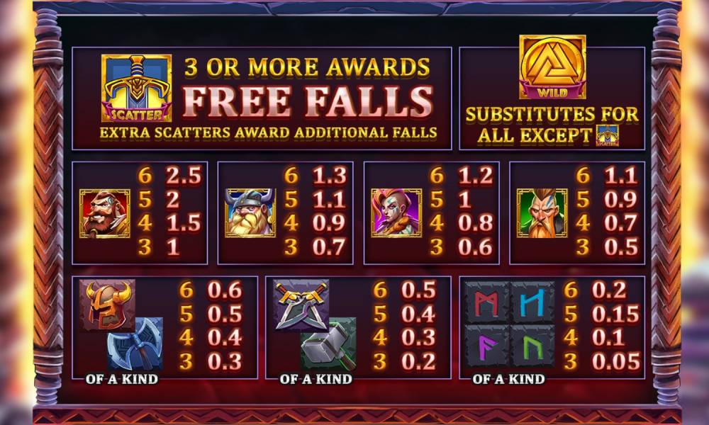Viking Fall takes players into the world of harsh Scandinavian warriors, where cold fjords, ancient runes and powerful gods determine the fate of each fighter. The slot's graphics are of high quality, with detailed symbols and animations that create the feeling of an epic battle. The musical accompaniment perfectly complements the atmosphere of Viking Fall. Loud drum beats, disturbing horn sounds and orchestral music make the player feel as if he is participating in a grand Viking campaign.