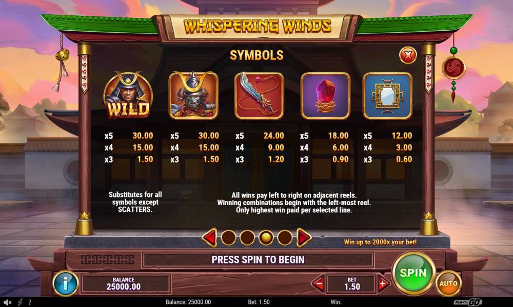 Whispering Winds slot from provider Play'n Go invites everyone to go back to the times of the samurai and try their luck in an attempt to get the hidden treasure. The game is made in a perfectly drawn style and its visual component was not once mentioned by critics. Free spins, coin collecting with respins and Mega Symbols await the player. Technical parameters make the slot as friendly to newcomers as possible. The average volatility leaves all chances for a pretty big score, because the maximum winnings are x2000 of the bet. The range of RTP values is made in such a way that there are only two acceptable indicators, and the rest will simply turn away casino visitors. Fascinating gameplay, frequent events on the playing field and a lot of free spins for risk lovers!
