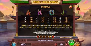 The Whispering Winds slot pleases with its simplicity, quality design and calm color scheme. The game control interface isn't shabby either. Under the field of reels there is a menu for selecting the bet, to the left of which under the "i" sign there is a payout table and information about bonus mechanics with the basic rules. To the right you can find launch buttons for manual and automatic mode (with options to limit the number of spins and force stop). All the most popular features of the machine are in direct accessibility.
